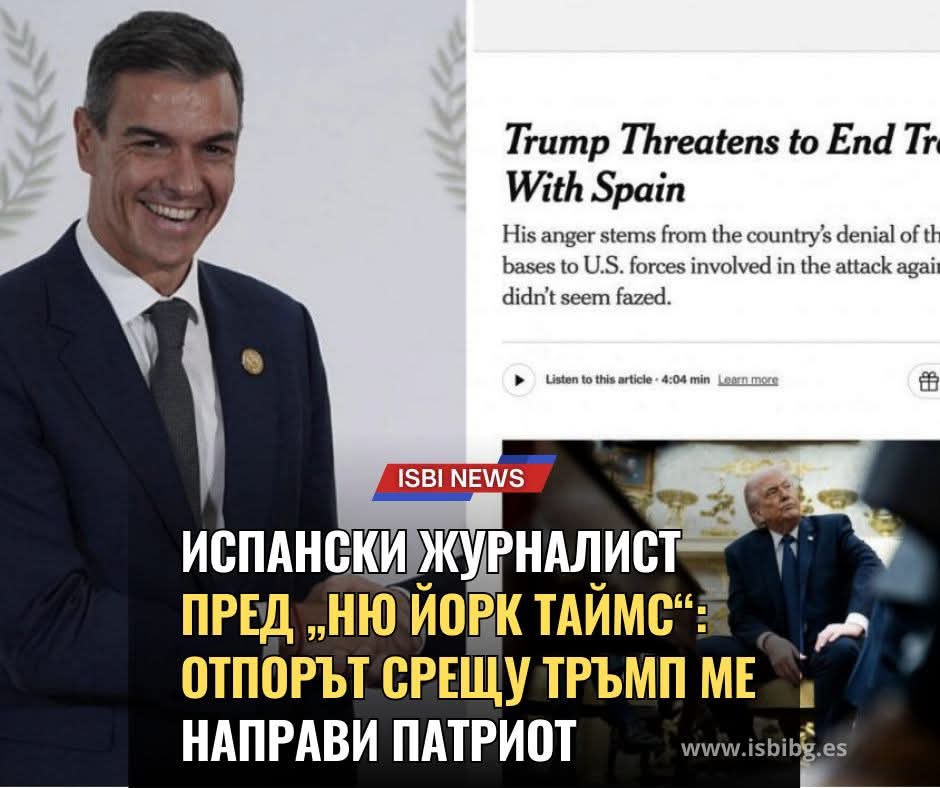 „Ню Йорк Таймс“ – едно от най-престижните издания в света с над 12 милиона абонати – публикува на първата си страница статия със заглавие „Отказът на Испания да приеме Тръмп ме направи патриот“. Материалът е дело на испанския журналист Пако Серда и анализира как съвременната политика влияе върху националното самочувствие.
